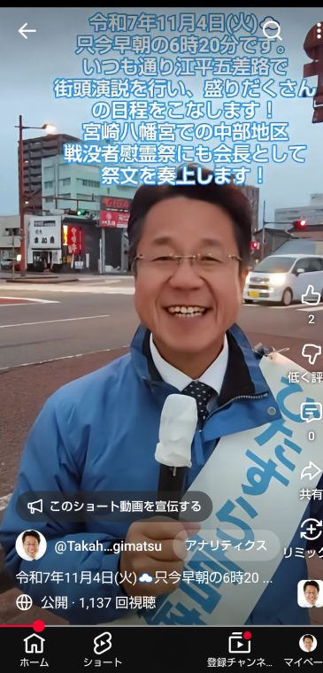 昨日はブログでもお伝えしましたように、県北の門川町そして美郷町をまわり、帰宅したのが夜9時半。様々に事務処理をし、あまり睡眠時間は取れませんでしたが、今朝もいつも通り、早朝の6時25分から江平五差路での街頭演説を始めました。