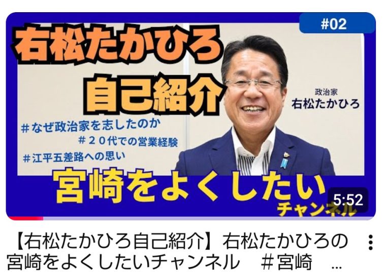 先日、完全リニューアルされた『右松たかひろの宮崎をよくしたいチャンネル』がスタートして、本日、2本目の動画となる【自己紹介】が公開しました!