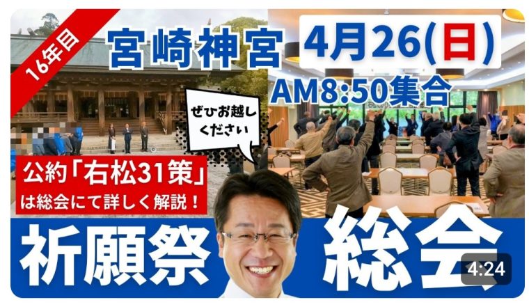 来週の日曜日4月26日(日)に『右松たかひろ「16年目 祈願祭・総会」』を、開催させていただきます!場所は宮崎神宮で、朝8時50分までに参道の参拝者休憩所にお集まりください。