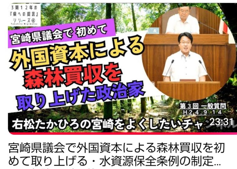 現在もそうですが、一般質問を行った12年3ヶ月前の当時、全国で大きな懸案となっていた外国資本による森林・土地買収を宮崎県議会において初めて取り上げました。あわせて水資源保全条例の制定を強く提言しています。