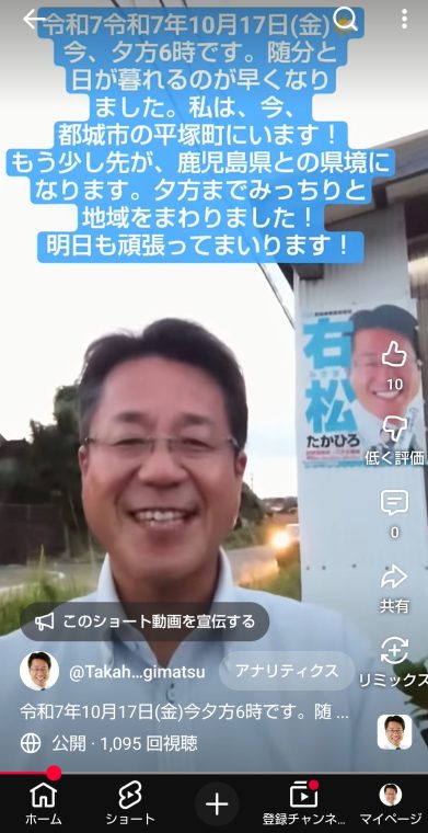 今日は江平五差路の街頭演説を終えると、国道10号線を都城方面へ向かい、各地域を訪問しました。夕方遅くに、鹿児島県との県境にあたる都城市平塚町まで、ようやく行き着きました。